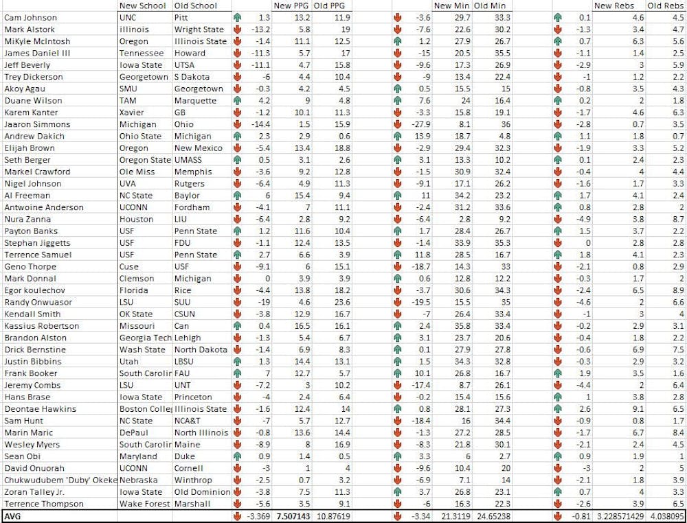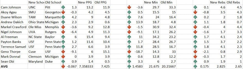 As most of these players left for bigger programs and bigger opportunities, the statistical drop-off shouldn't be much of surprise. The group as a whole averaged 10.88 points per game prior to transferring and 7.51 points per game after. What that means is simple.