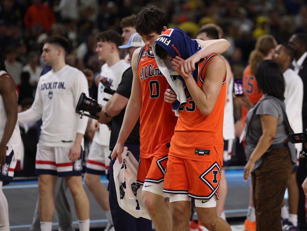 Illinois' David Mirkovic, left, and Keaton Wagler walk off the court after a 71-62 loss to UConn in the Final Four of the NCAA Tournament on Saturday, April 4, 2026, at Lucas Oil Stadium in Indianapolis. (Armando L. Sanchez/Chicago Tribune/TNS)