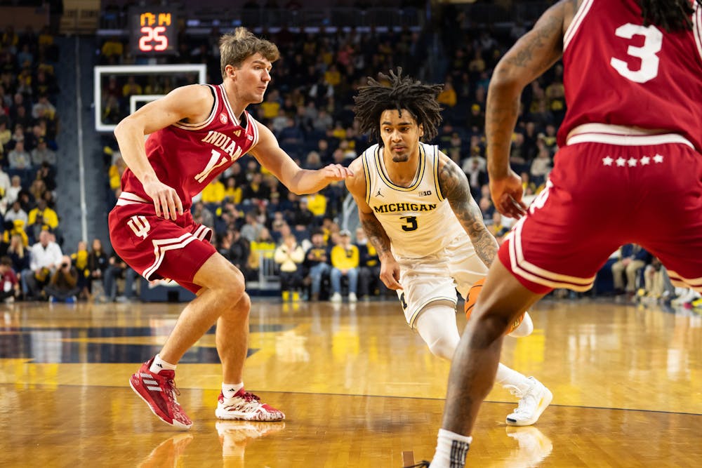 Michigan's Elliot Cadeau, middle, drives to the basket against Indiana's Trent Sisley, left, during the first half at Crisler Arena on Tuesday, Jan. 20, 2026, in Ann Arbor, Michigan. (Jaime Crawford/Getty Images/TNS)