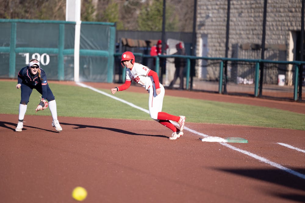 Hannah Haberstroh takes off from first base during Indiana's win over Detroit Mercy on March 27, 2026. (HN photo/Lindsey Soet)