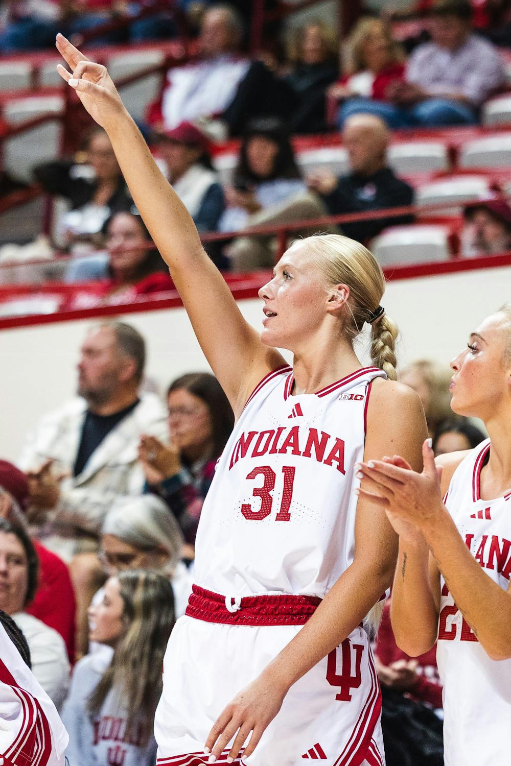 Faith Wiseman celebrates on the bench during Indiana's exhibition win over Missouri S&T on Oct. 27, 2025. (HN photo/Kallan Graybill)