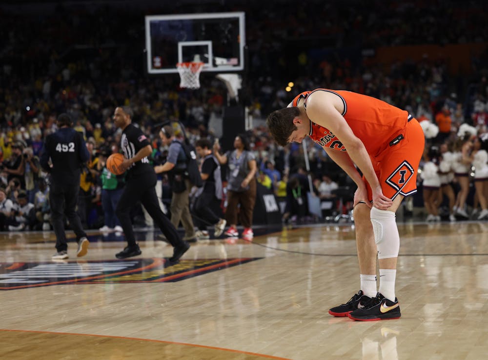 Illinois forward Ben Humrichous bows his head on the court after a 71-62 loss to UConn in the Final Four on April 4, 2026, at Lucas Oil Stadium in Indianapolis. (Armando L. Sanchez/Chicago Tribune/Tribune Content Agency)
