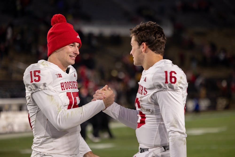 November 29Fernando Mendoza (right) and Bray Lynch celebrate during Indiana's win over Purdue on Nov. 28, 2025. (HN photo/Shelby Gosser)