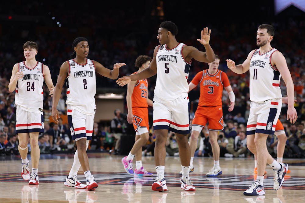 UConn's Tarris Reed Jr. (5) shakes hands with teammates Alex Karaban (11) and Silas Demary Jr. (2) during the second half against Illinois in the Final Four of the NCAA Tournament at Lucas Oil Stadium on Saturday, April 4, 2026, in Indianapolis. (Patrick Smith/Getty Images/TNS)